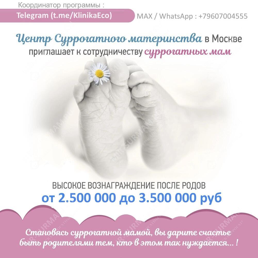🤰🙏 👪 Приглашаем женщин от 20 до 34,4* лет в программу СУРРОГАТНОЕ МАТЕРИНСТВО . СТАНЬТЕ СУРРОГАТНОЙ МАМОЙ - ПОДАРИТЕ РАДОСТЬ МАТЕРИНСТВА🙏 Вознаграждение после родов от 𝟐.𝟓𝟎𝟎 𝟎𝟎𝟎 до 𝟑.𝟓𝟎𝟎 𝟎𝟎𝟎 рублей , дополнительно ежемесячное пособие 𝟓𝟎.𝟎𝟎𝟎 рублей, доплата за двойню - 𝟑𝟎𝟎.𝟎𝟎𝟎 руб. Питание, одежда и другие доплаты. Программа суррогатного материнства👇🏻 ✅ Решит ваши финансовые проблемы меньше чем за год Условия: ✔- Компенсация проезда до Москвы и обратно. ✔- При необходимости предоставляется жилье рядом с клиникой. ✔- Обследование за счет клиники ✔- Квалифицированная медицинская помощь от и до ✔- Юридическое сопровождение 100% гарантия ✔- Программа без ожидания ✔- Официальный договор Вы можете стать суррогатной мамой, если: ⠀ 🙏Вы всегда хотели сделать что-то очень значимое и доброе. 🙏 Привести в этот мир ребёнка, которого не может выносить его мама - самый великодушный поступок. - Вы здоровы физически и психически. - У Вас есть свои детки, рождённые естественным путём. - В самом расцвете сил - от 𝟐𝟎- 𝟑𝟰,𝟰* лет 🙏 У Вас есть мечта, на которую Вы всё никак не можете накопить. Будь то машина, путешествие или хорошее образование для Вашего ребёнка. Анкета для участие 👉🏻 vk.cc/7bEK1q или anketa-sm-do.ru/ ___________________________ ❗ Координатор программы : Telegram Telegram (t.me/KlinikaEco) / MAX / WhatsApp : +79607004555 (Анжела Юрьевна) 18+ Есть противопоказания. Требуется консультация специалиста..